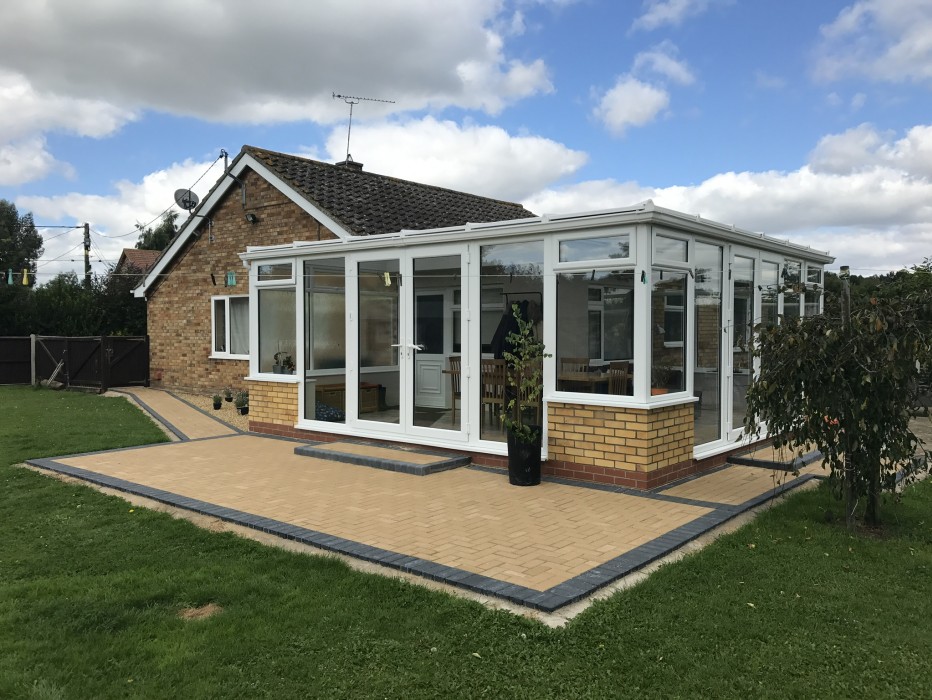 Large wrap around corner conservatory with box gutters against a detached bungalow